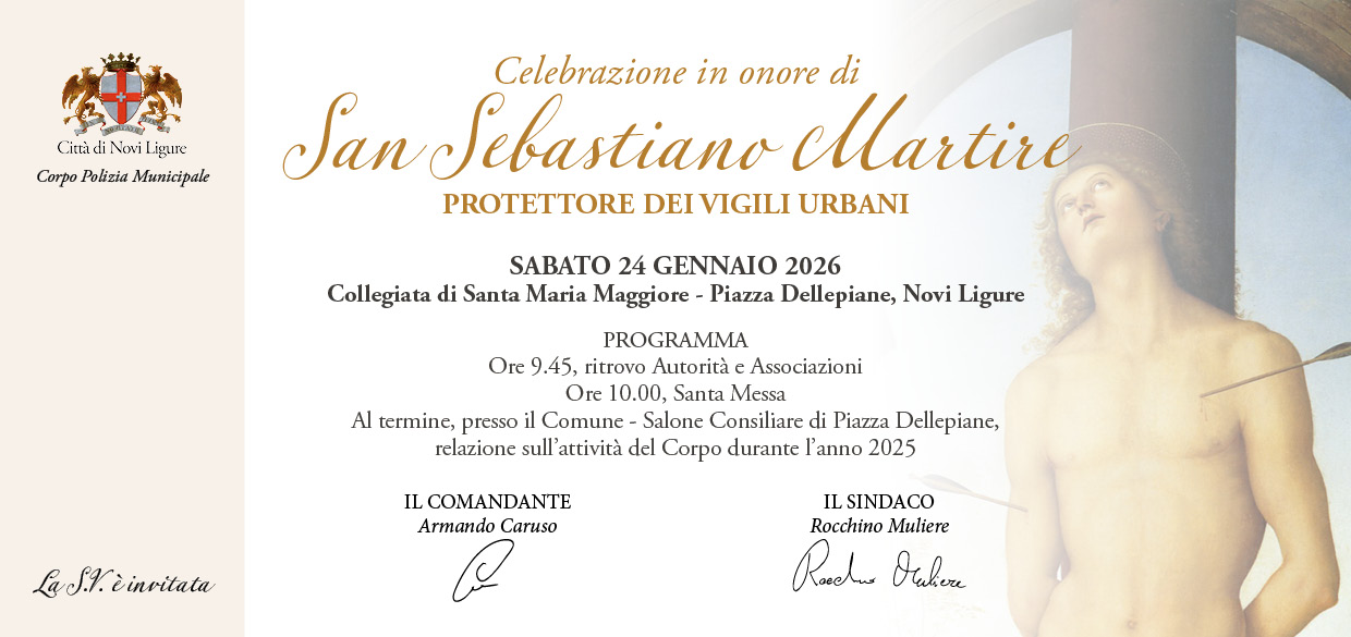 Sabato 24 gennaio, la Città di Novi Ligure celebra la ricorrenza di San Sebastiano Martire, Santo Patrono del Corpo di Polizia Municipale. La cerimonia, che rappresenta un momento di incontro tra il Comando, le Istituzioni e la cittadinanza, si aprirà con la tradizionale funzione religiosa per concludersi con il bilancio delle attività operative svolte sul territorio.