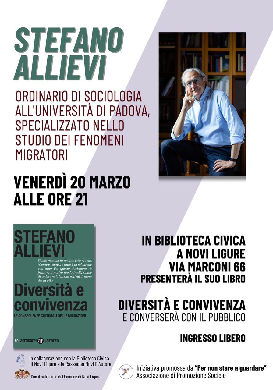 Quali sono le sfide della convivenza in un mondo che cambia? Come si governano davvero i flussi migratori? Per rispondere a queste domande, l’associazione “Per non stare a guardare aps” invita la cittadinanza a un incontro di alto profilo scientifico e divulgativo con il Professor Stefano Allievi. L’evento, patrocinato dal Comune di Novi Ligure, si terrà venerdì 20 marzo alle ore 21 presso i locali della Biblioteca Civica in via Marconi, 66.