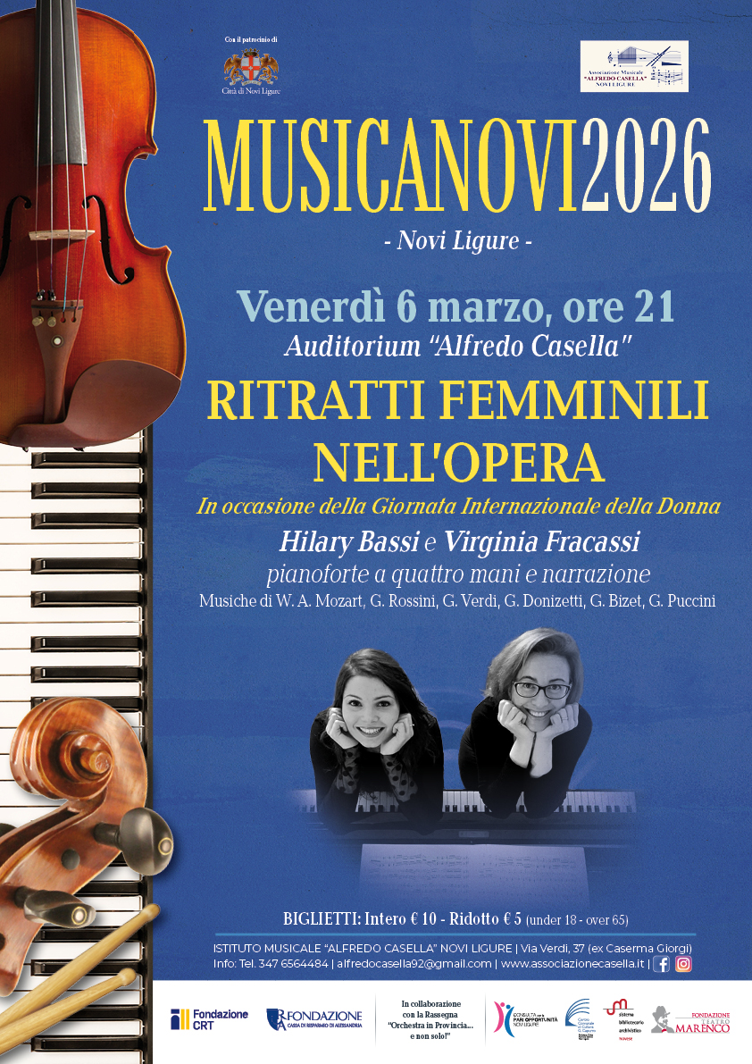 Le celebrazioni prenderanno il via venerdì 6 marzo, alle ore 21, presso l’Auditorium “Alfredo Casella” (via Verdi 37) con il concerto "Ritratti femminili nell’opera", inserito nella rassegna Musicanovi 2026. Protagoniste della serata saranno Hilary Bassi e Virginia Fracassi, impegnate in un’esibizione al pianoforte a quattro mani arricchita da interventi narrativi. Il programma musicale renderà omaggio alle grandi eroine del melodramma attraverso le composizioni di maestri quali W.A. Mozart, G. Rossini, G. Verdi, G. Donizetti, G. Bizet e G. Puccini.
