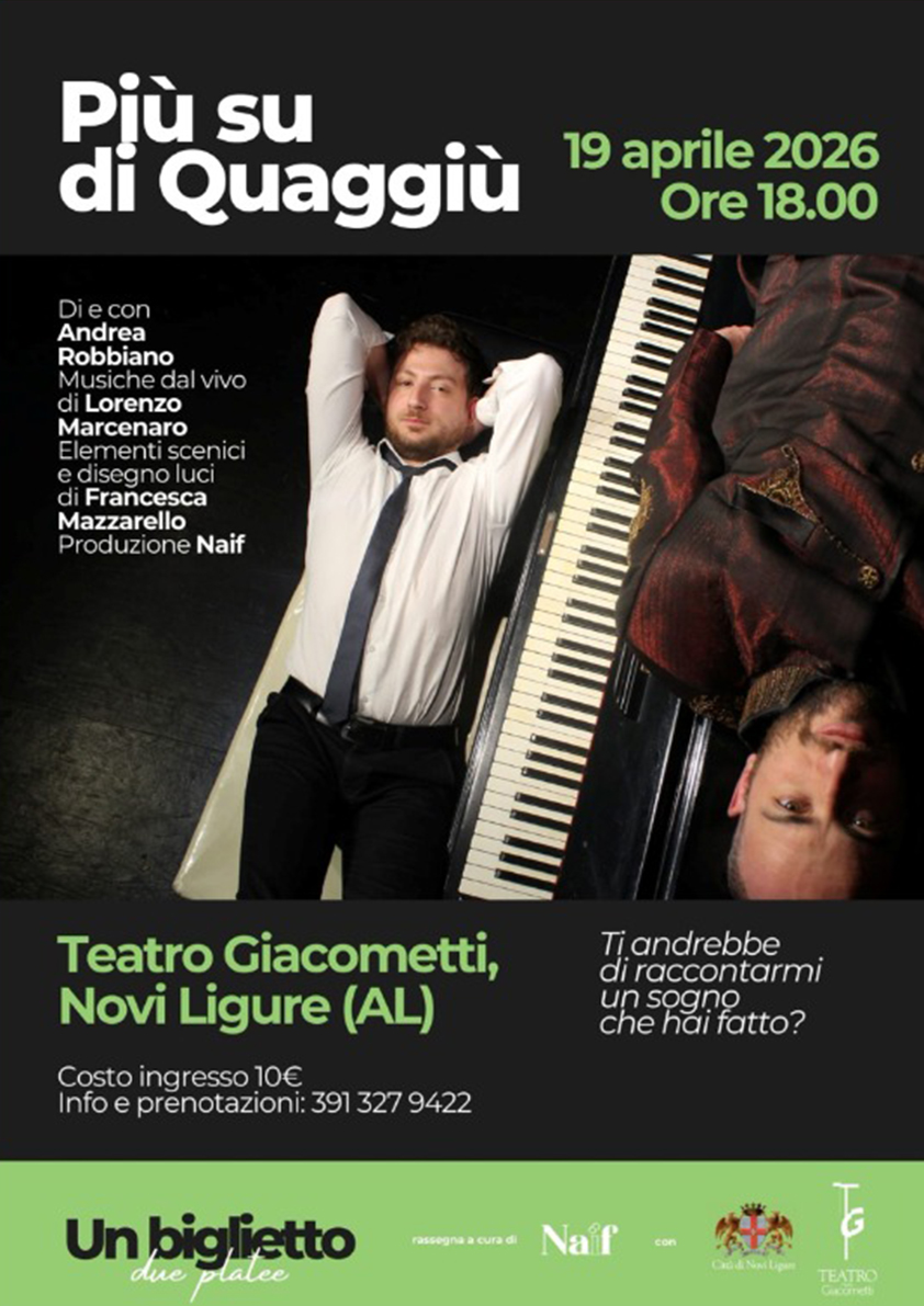 Domenica 19 aprile, alle ore 18:00, il Teatro Giacometti ospiterà lo spettacolo "Più su di quaggiù", una produzione firmata Naïf con protagonista Andrea Robbiano, che ne è anche l'autore. La performance sarà arricchita dalle musiche dal vivo di Lorenzo Marcenaro, mentre la cura degli elementi scenici e del disegno luci è affidata a Francesca Mazzarello. Lo spettacolo è un ritorno all’anima del teatro in cui, come in un rito intorno al fuoco, un attore e un pianista mettono in scena i sogni del pubblico.