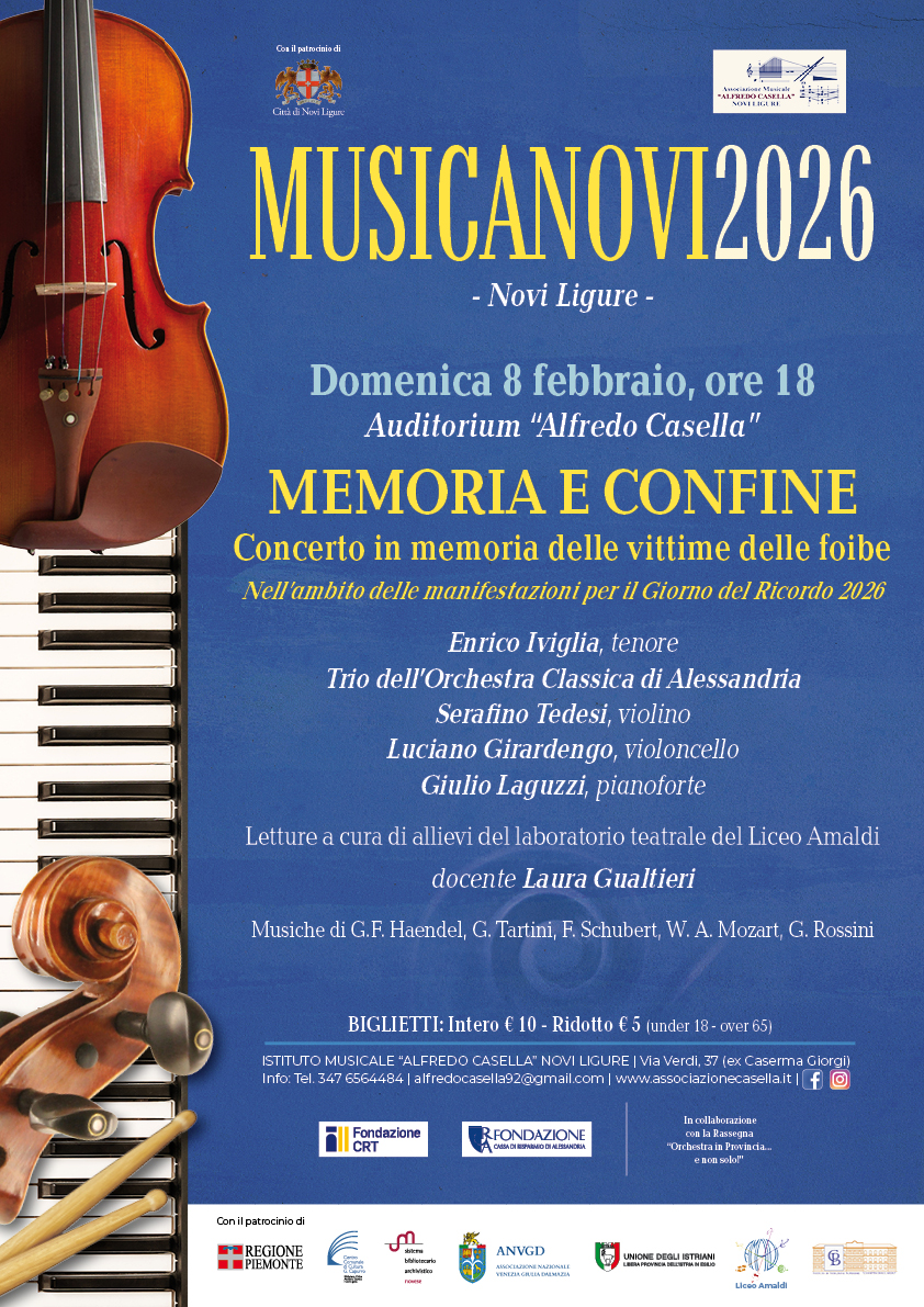 Il programma delle celebrazioni per il Giorno del Ricordo prende il via domenica 8 febbraio alle ore 18, con “Memoria e confine”, concerto in memoria delle vittime delle foibe. L’evento, inserito nella rassegna concertistica Musicanovi 2026, si terrà nell’auditorium “Alfredo Casella” di via Verdi 37 e vedrà protagonisti il tenore Enrico Iviglia e il Trio dell’Orchestra Classica di Alessandria (Serafino Tedesi al violino, Luciano Girardengo al violoncello e Giulio Laguzzi al pianoforte). Le letture saranno a cura degli allievi del laboratorio teatrale del Liceo Amaldi (docente Laura Gualtieri).
