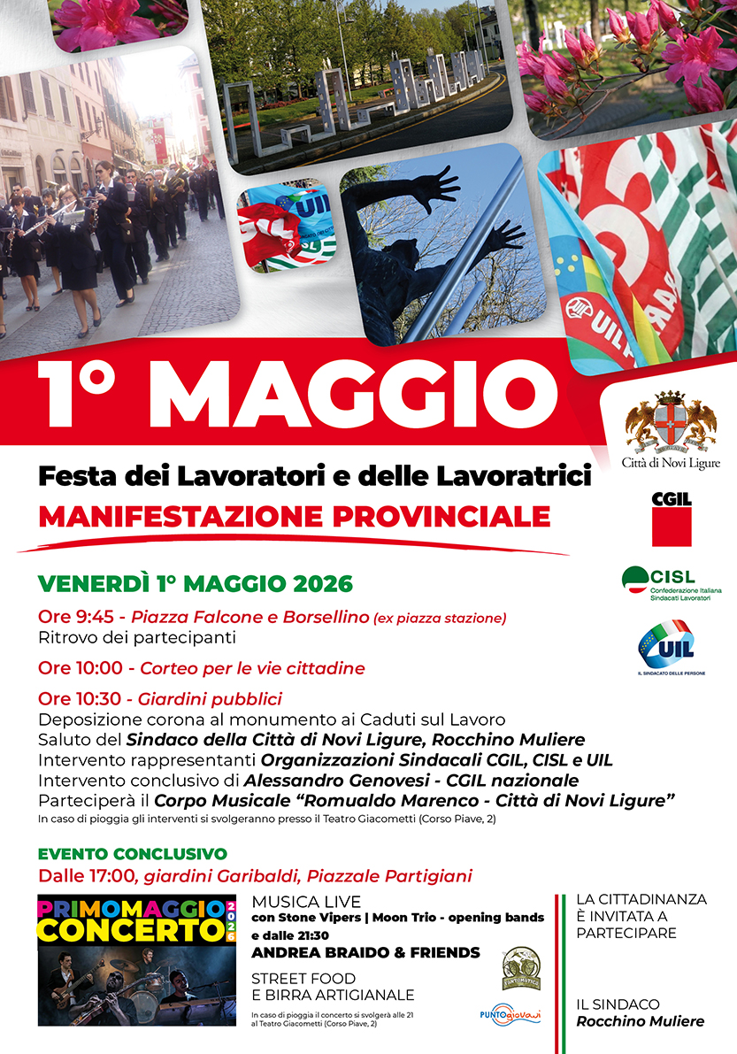 Seguiranno il saluto del Sindaco, Rocchino Muliere, e gli interventi dei rappresentanti delle Organizzazioni Sindacali Cgil, Cisl e Uil. L’intervento conclusivo della mattinata sarà affidato ad Alessandro Genovesi della Cgil nazionale. Alla giornata parteciperà il Corpo Musicale “Romualdo Marenco – Città di Novi Ligure”. In caso di pioggia, gli interventi si terranno presso il Teatro Giacometti in Corso Piave, 2.
