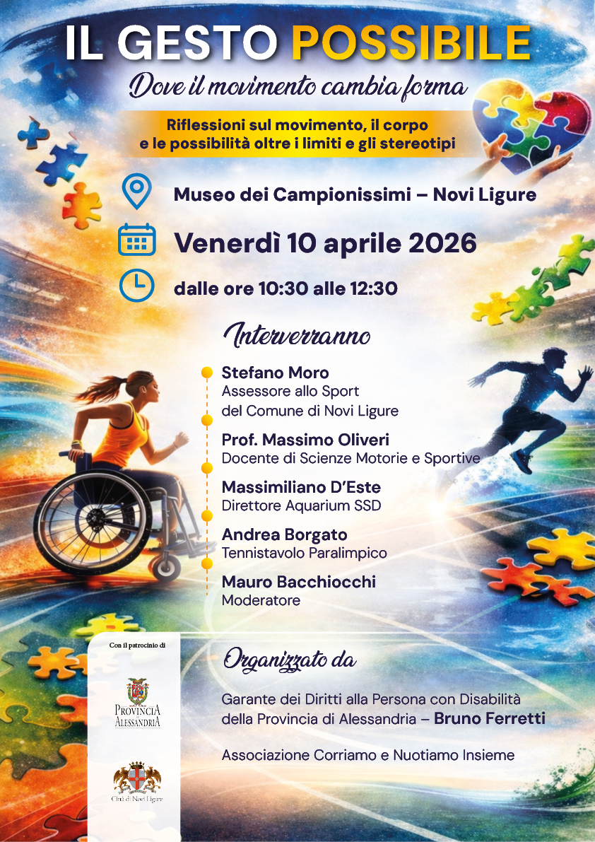 Si terrà a Novi Ligure, al Museo dei Campionissimi, l'evento dal titolo "Il Gesto Possibile – Dove il movimento cambia forma". L'appuntamento è fissato per venerdì 10 aprile 2026, dalle ore 10:30 alle 12:30.