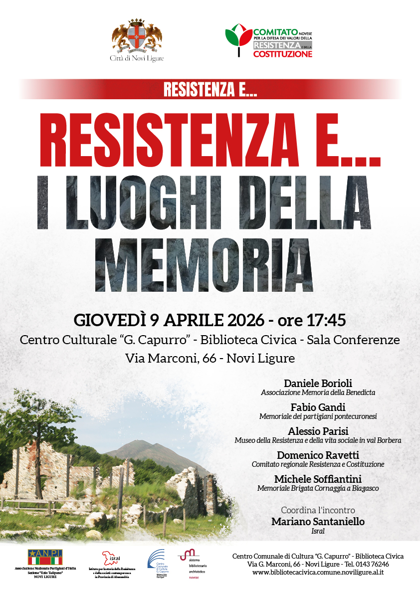 Giovedì 9 aprile, alle ore 17.45, la sala conferenze della Biblioteca civica (via Marconi, 66) ospiterà un nuovo evento dal titolo “Resistenza e... I Luoghi della Memoria”. L’incontro, che sarà coordinato da Mariano Santaniello dell'Isral, vedrà il contributo di autorevoli esponenti della rete memoriale del territorio. Interverranno Daniele Borioli per l'Associazione Memoria della Benedicta, Fabio Gandi per il Memoriale dei partigiani pontecuronesi, Alessio Parisi in rappresentanza del Museo della Resistenza e della vita sociale in val Borbera, Domenico Ravetti per il Comitato regionale Resistenza e Costituzione e Michele Soffiantini per il Memoriale Brigata Cornaggia a Biagasco.