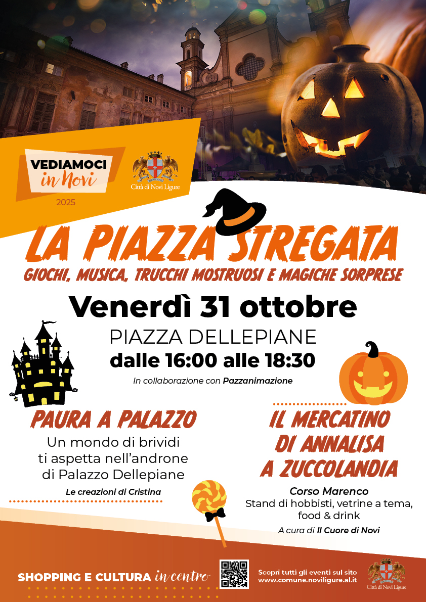 Dalle ore 16:00 alle 18:30, Piazza Dellepiane si trasformerà ne "La Piazza Stregata", offrendo giochi, musica, trucchi mostruosi e magiche sorprese con ingresso libero e divertimento garantito, a cura di Pazzanimazione.