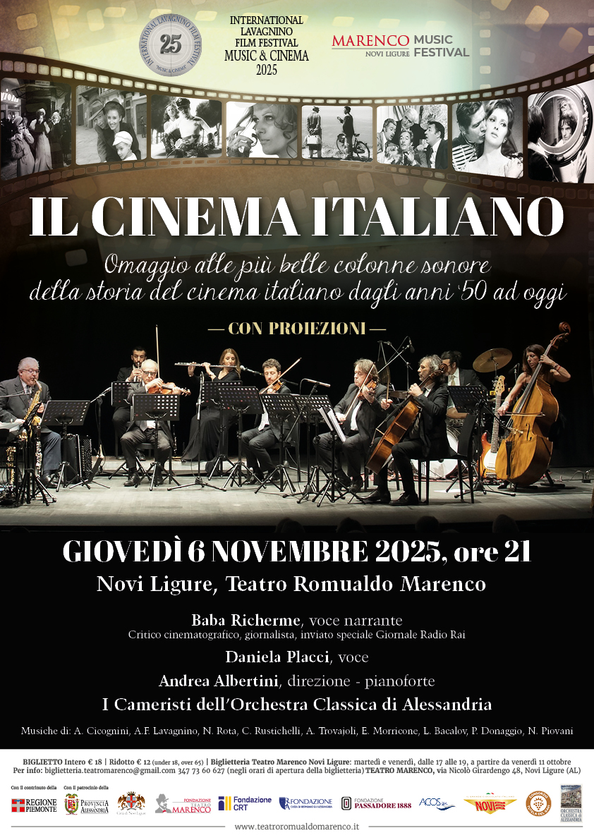 È per giovedì 6 novembre alle ore 21 il primo appuntamento della 25^ edizione dell'International Lavagnino Film Festival "Music & Cinema", ospitato anche quest'anno nella prestigiosa location del Teatro Romualdo Marenco di Novi Ligure. Il concerto dal titolo "Il cinema italiano", omaggio alle più belle colonne sonore del cinema dagli anni 50 ad oggi, è realizzato in co-produzione con la Fondazione Teatro Marenco di Novi Ligure, il suo direttore Sandro Bondi e il sostegno della SIAE, di sponsor Istituzionali, bancari (Fondazione Cral di Alessandria, Fondazione CRT di Torino) e privati. Un progetto che esalta i più prolifici e significativi compositori cinematografici italiani nei differenti periodi dal dopoguerra ai giorni nostri.