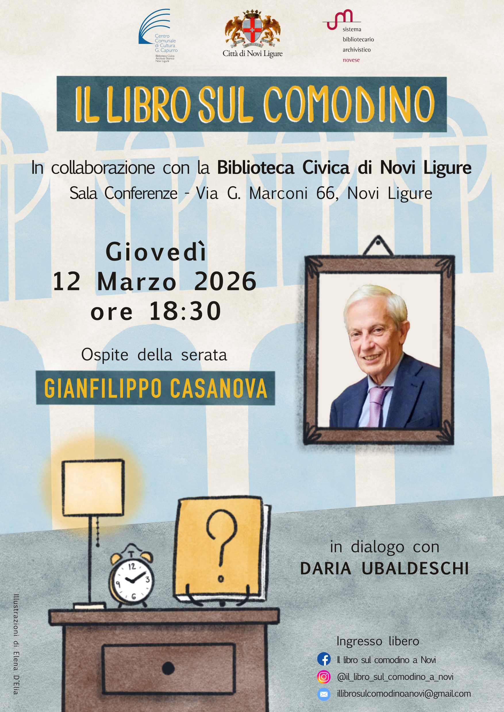 Ricordiamo che è possibile seguire l’attività del gruppo - composto da Daria Ubaldeschi, Elena D’Elia, Benedetta De Paolis, Graziella Gaballo, Giada Incardona e Andrea Vignoli – essere informati sui vari appuntamenti e commentarli, attraverso la pagina Facebook Il libro sul comodino a Novi e attraverso Instagram @il_libro_sul_comodino_a_novi.