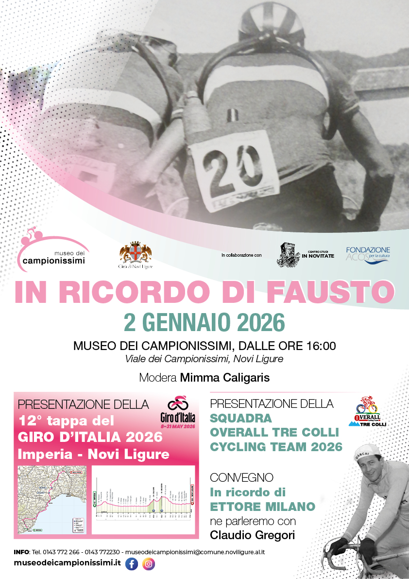Alle ore 16 si terrà l’omaggio al Campionissimo racchiuso nel titolo “In ricordo di Fausto”, evento organizzato dal Comune di Novi Ligure in collaborazione con il Centro Studi In Novitate e la Fondazione ACOS per la cultura.