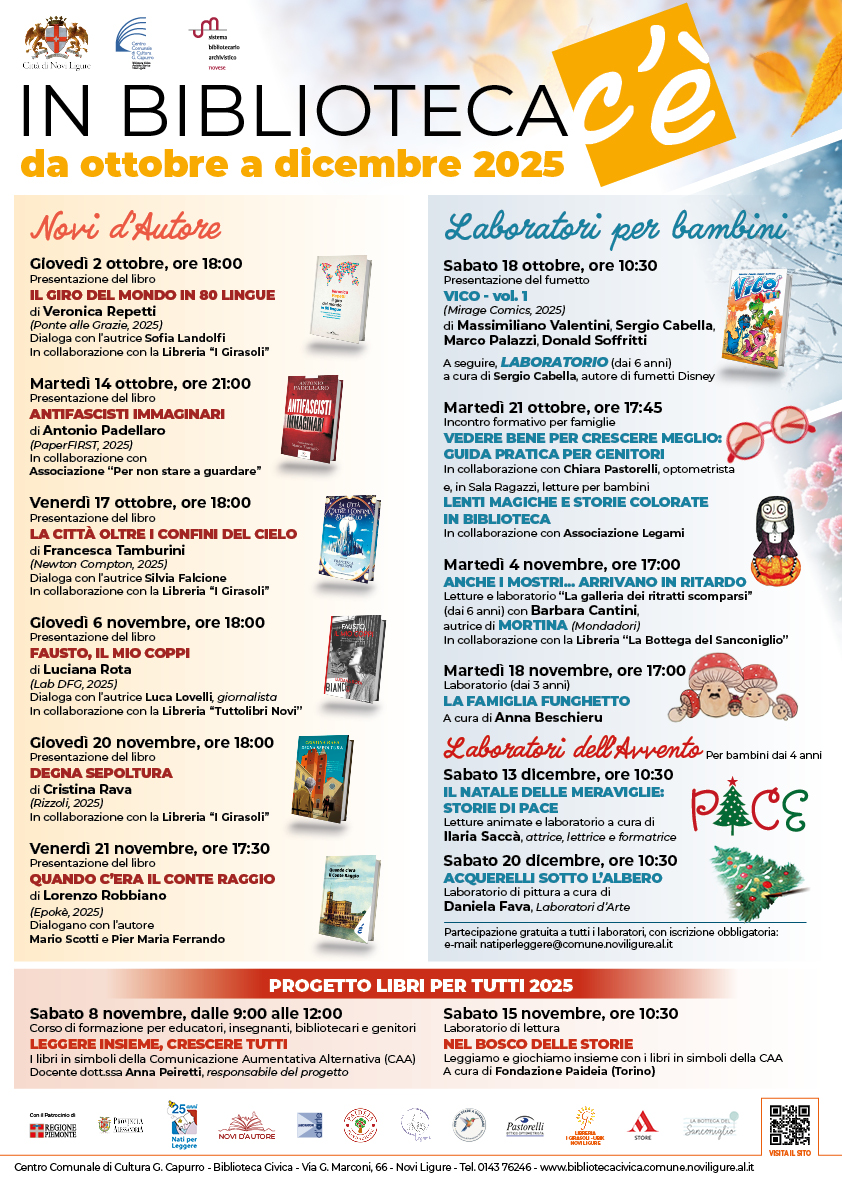 Da ottobre a dicembre 2025 la Biblioteca Civica propone un nuovo ciclo di appuntamenti culturali inseriti nella rassegna “In Biblioteca c’è”, un progetto, ormai consolidato, che si propone di dare spazio e valorizzare autori e temi sia del territorio che conosciuti a livello nazionale.