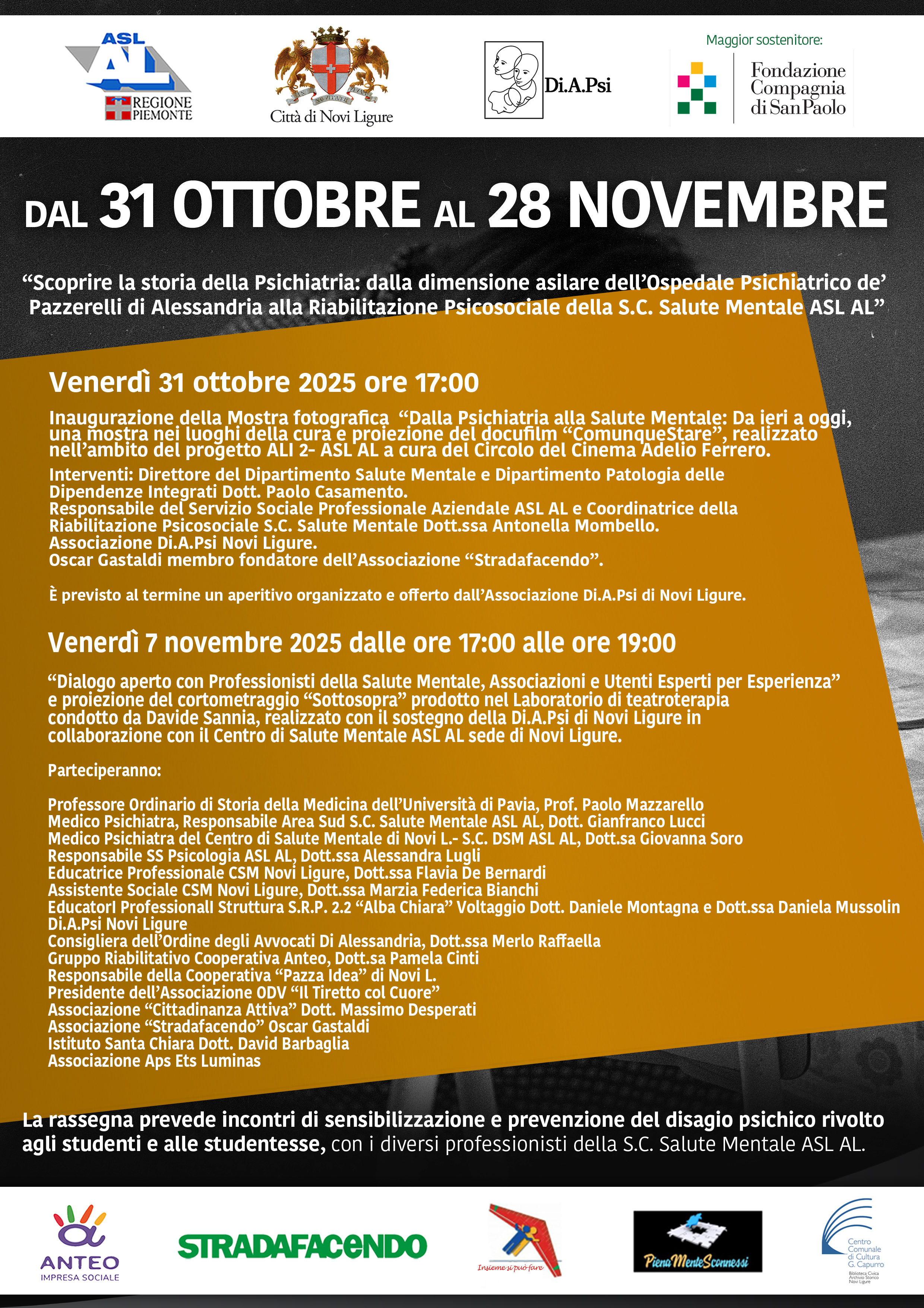 Venerdì 31 ottobre 2025 ore 17:00 – Inaugurazione della Mostra fotografica “Dalla Psichiatria alla Salute Mentale: Da ieri a oggi, una mostra nei luoghi della cura e proiezione del docufilm “ComunqueStare”, realizzato nell’ambito del progetto ALI 2 a cura del Circolo del Cinema Adelio Ferreo. È previsto al termine un aperitivo organizzato e offerto dall’Associazione Di.A.Psi di Novi Ligure.