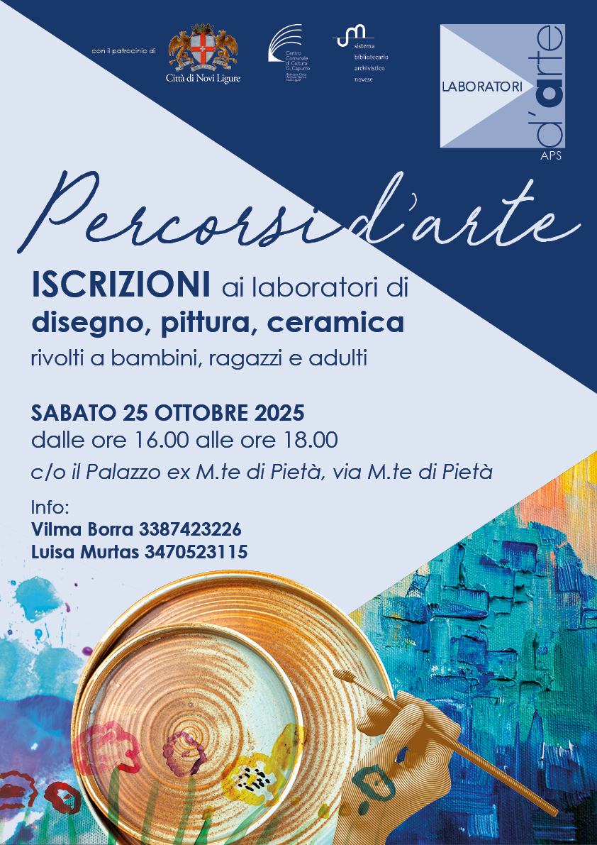 Sabato 25 ottobre dalle 16 alle 18 presso il Palazzo ex M.te di Pietà in via M.te di Pietà, Novi Ligure, si apriranno le iscrizioni a "Percorsi d'arte", i laboratori di disegno, pittura e ceramica, organizzati dall'associazione novese Laboratori d'arte, patrocinati dal Comune e dalla Biblioteca Civica Avranno cadenza settimanale da novembre a maggio e saranno rivolti a ragazzi ed adulti. Quelli per i giovani allievi si terranno il sabato dalle 15 alle 17 a cura dell' insegnante Daniela Fava. Per gli adulti, stesso giorno ed orario ma con la guida del maestro Roberto Bonafe'.
