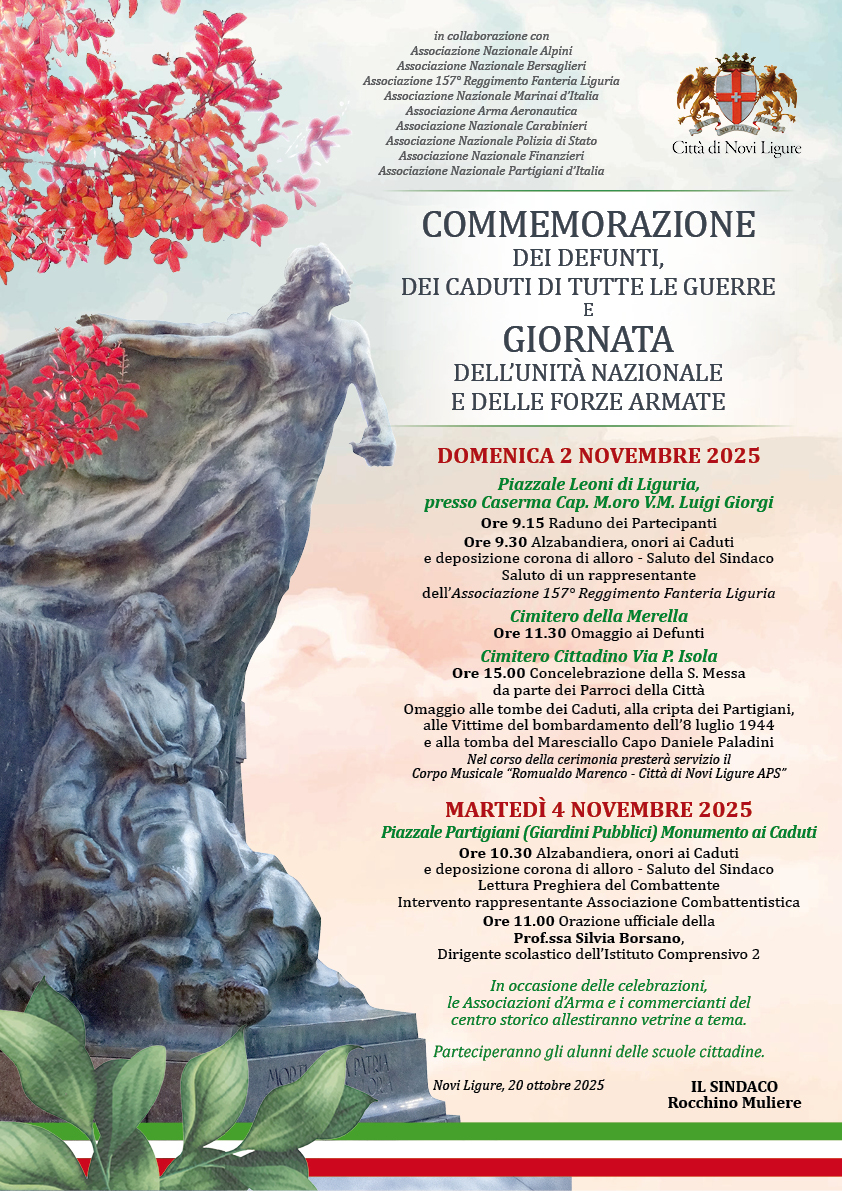 Ore 15.00 Concelebrazione della S. Messa da parte da parte dei Parroci della Città. Omaggio alle tombe dei Caduti, alla cripta dei Partigiani, alle Vittime del bombardamento dell'8 luglio 1944 e alla tomba del Maresciallo Capo Daniele Paladini. Nel corso della cerimonia presterà servizio il Corpo Musicale “Romualdo Marenco – Città di Novi Ligure APS”