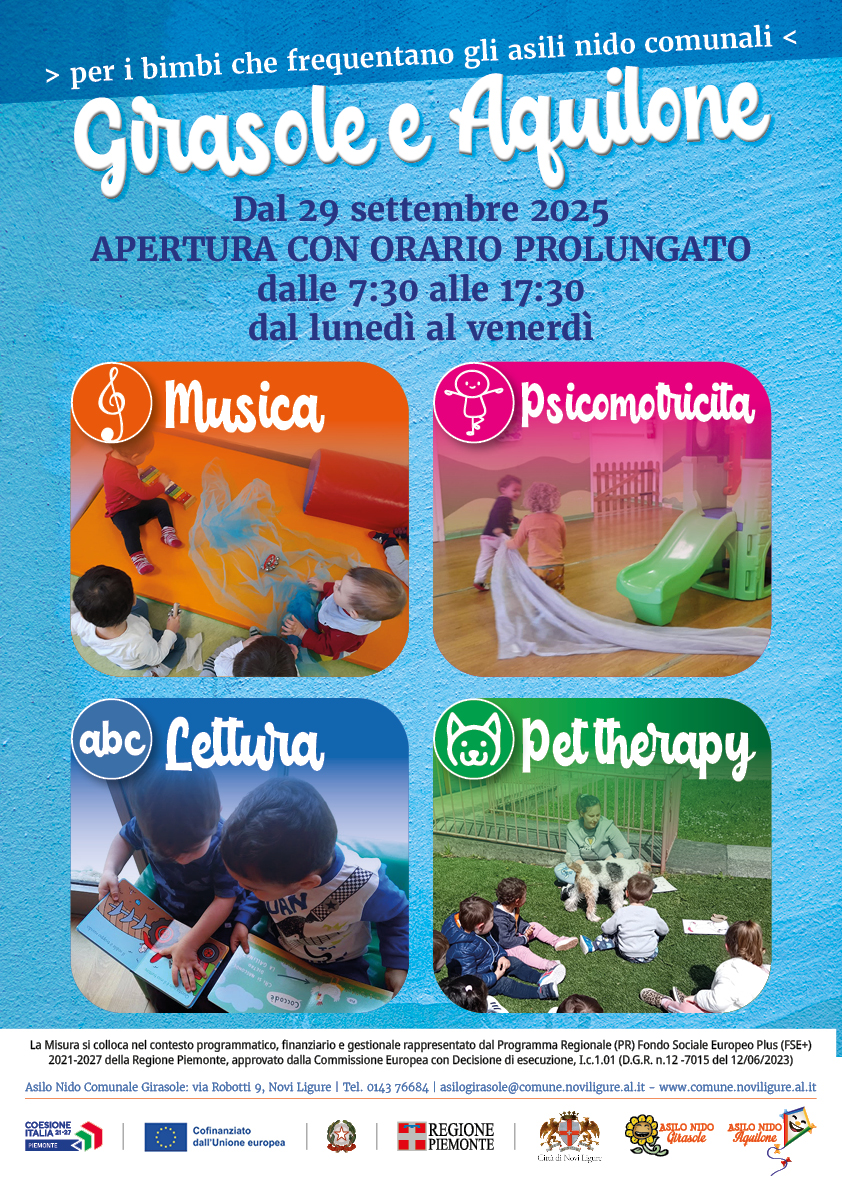 A partire dal 29 settembre 2025 e per l'intero anno scolastico 2025/2026, gli Asili Nido Comunali Aquilone e Girasole estenderanno il loro orario di apertura, che sarà dalle 7:30 alle 17:30.