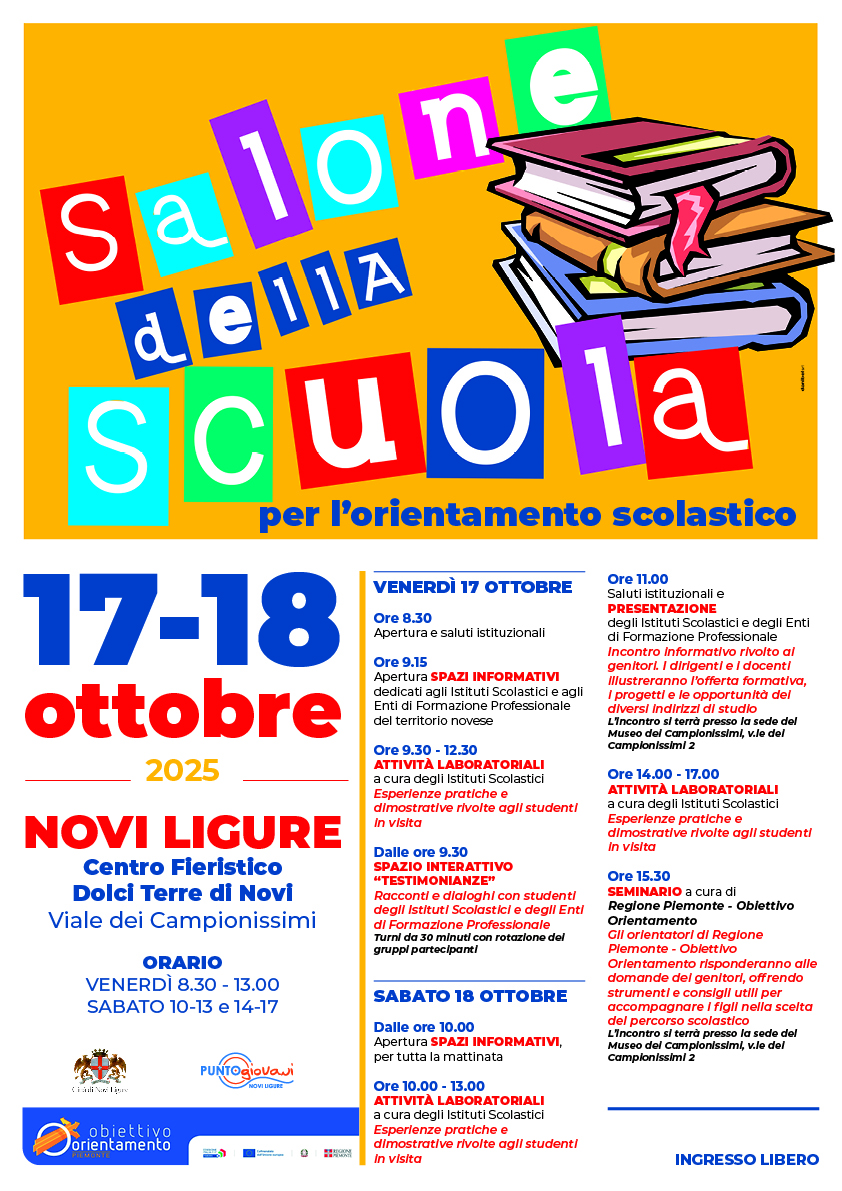 Il Comune di Novi Ligure, in collaborazione con gli istituti scolastici del territorio e con il supporto di Regione Piemonte – Obiettivo Orientamento, organizza una nuova edizione del Salone della Scuola. L’evento, dedicato all’orientamento e alla conoscenza dell’offerta formativa per studenti e famiglie, si terrà nelle giornate del 17 e 18 ottobre nel centro fieristico Dolci Terre di Novi.